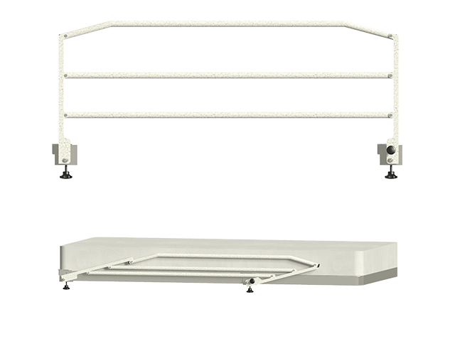 Fabricadas en acero con acabado en epoxy. Acoplamientos que permiten su uso en todo tipo de camas. Abatibles. Extremadamente resistentes al uso.