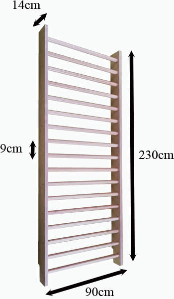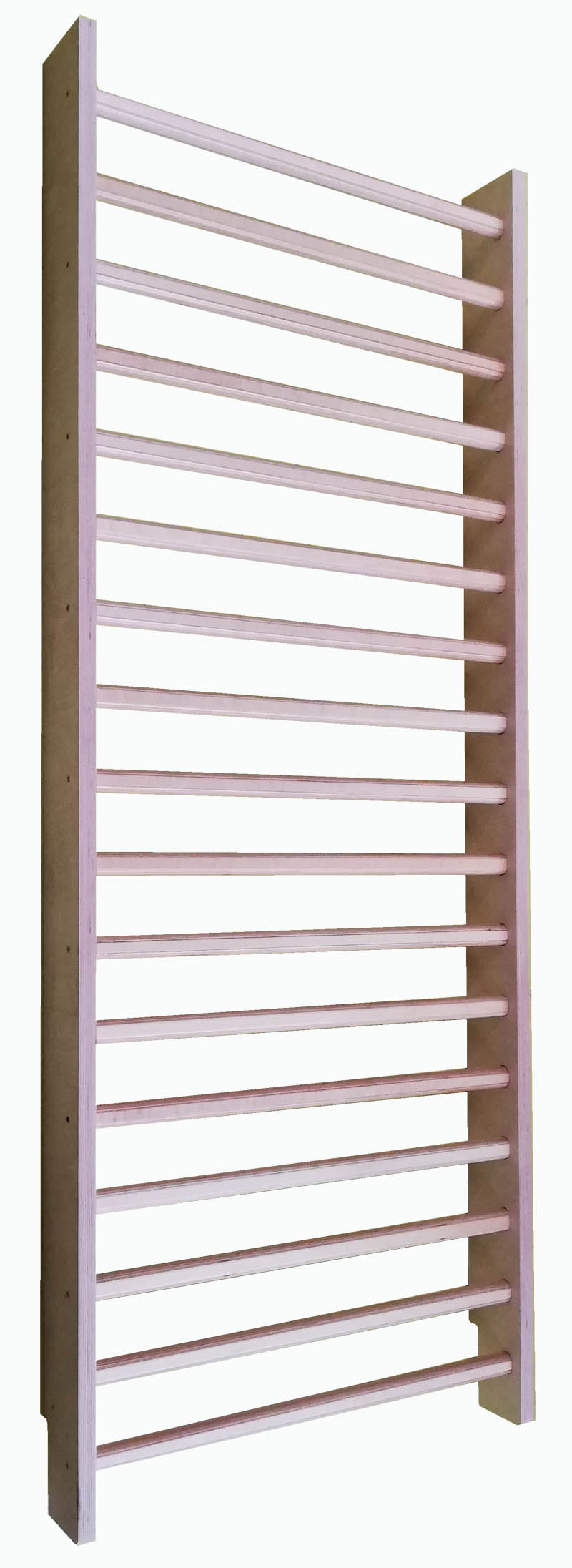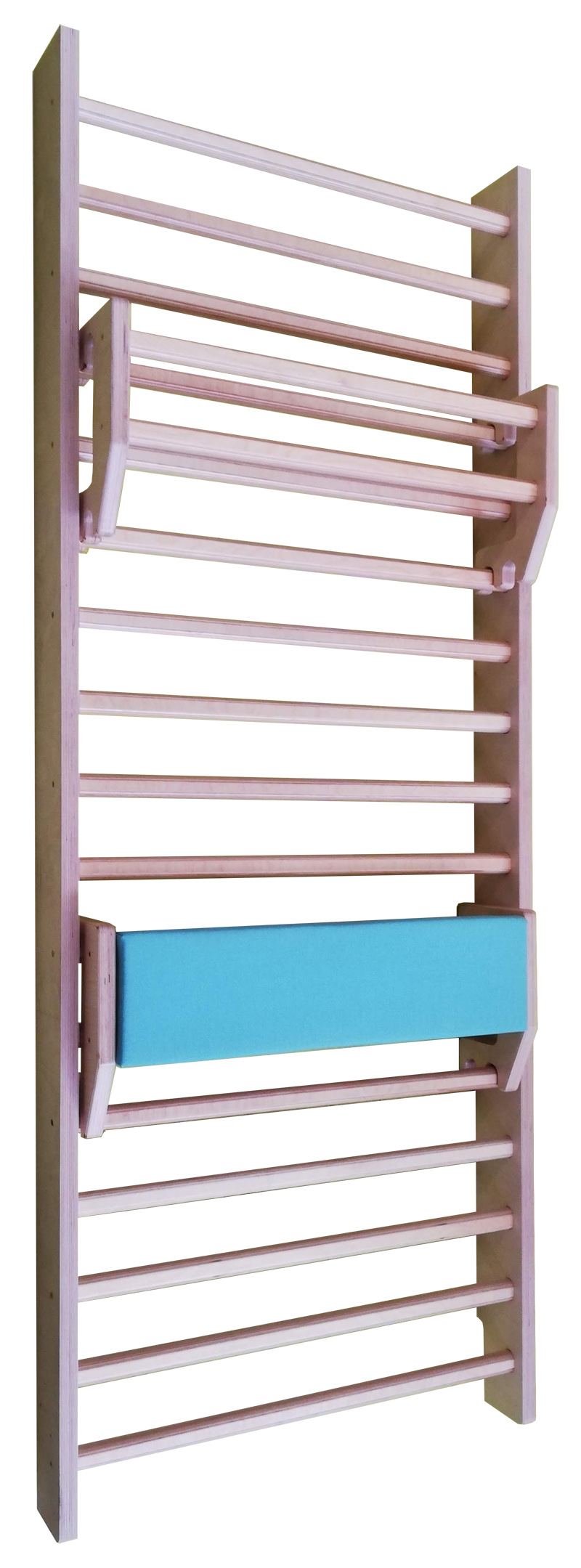 Consta de dos laterales macizos y diecisiete barras transversales ovaladas que encajan en los anteriores. Todas las barras transversales se posicionan a la misma distancia de la pared y con una separación entre ellas idéntica. La parte inferior lleva un rebaje para salvar el posible zócalo de la pared. Con los accesorios soporte con apoyo acolchado (ref.2121) y/o soporte con barras adicionales (ref.2122) este producto se puede adaptar para la ejercitación de niños y adultos de muy diferentes estaturas.